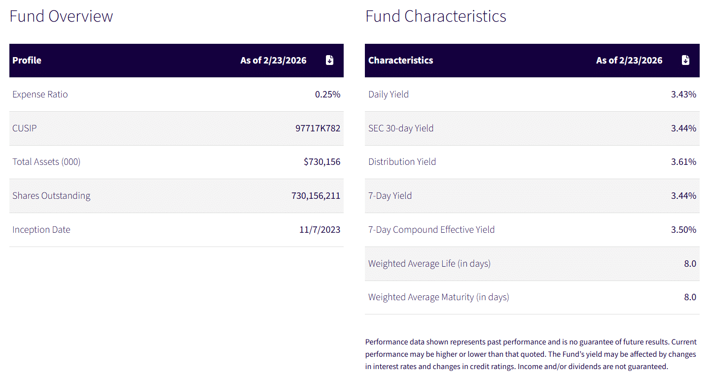 WTGXX targets a stable net asset value of one dollar by investing in short-term Treasury and government securities. As of February 23, the fund had accumulated $730 million in assets and carried an expense ratio of 0.25%.