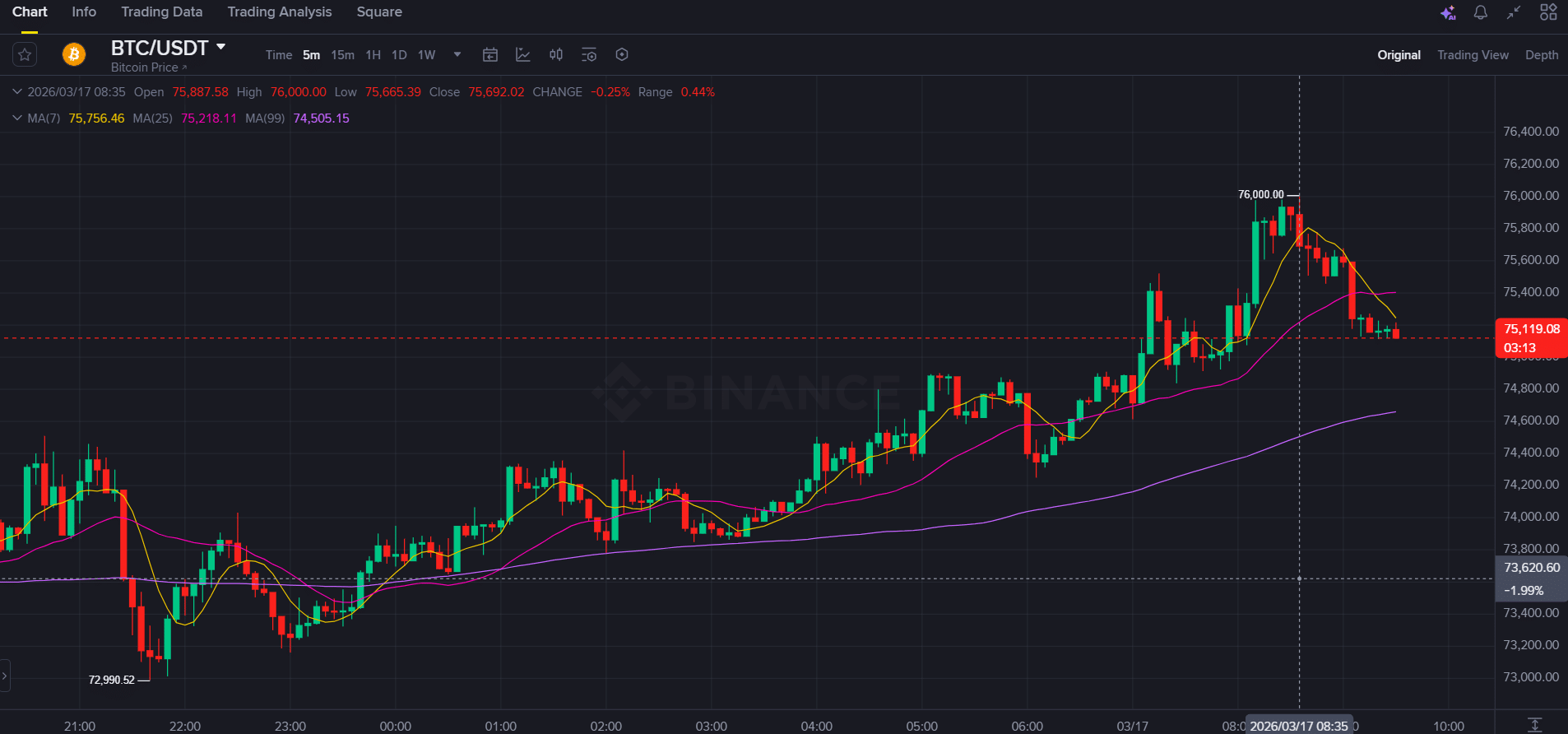 Bitcoin climbed as high as $76,000 on Binance on Monday, with investors piling into digital assets ahead of a pivotal stretch of global macro events, including US inflation data, the Federal Reserve’s updated “dot plot,” and a policy decision from the Bank of Japan.