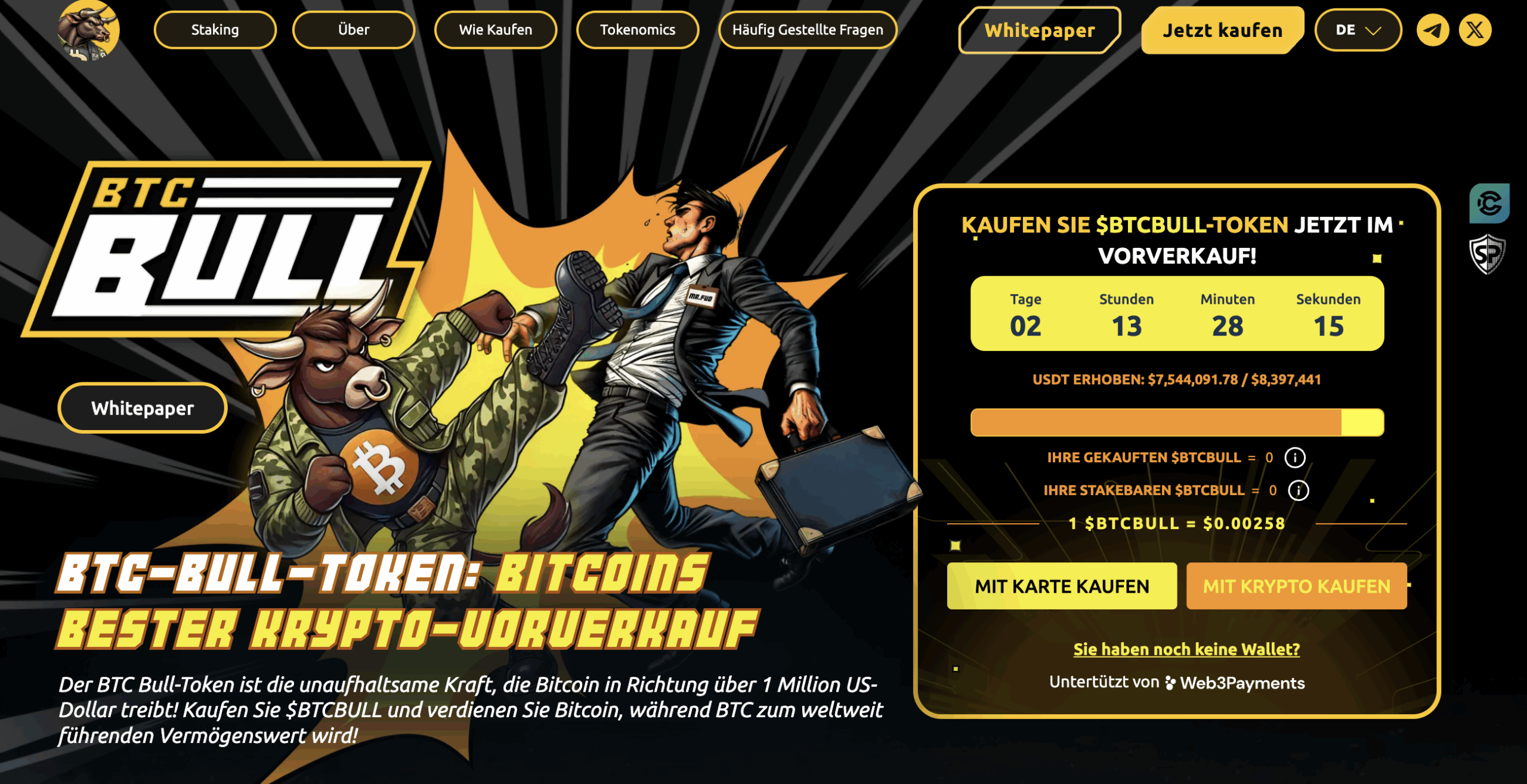 Um an den letzten 72 Stunden des Presales teilzunehmen, besuchen Sie die BTC Bull-Website und verbinden Sie eine Wallet, um mit ETH, USDT oder einer Bankkarte zu kaufen. Um sich für BTC Airdrops zu qualifizieren, können Sie Ihre Wallet in Best Wallet importieren.