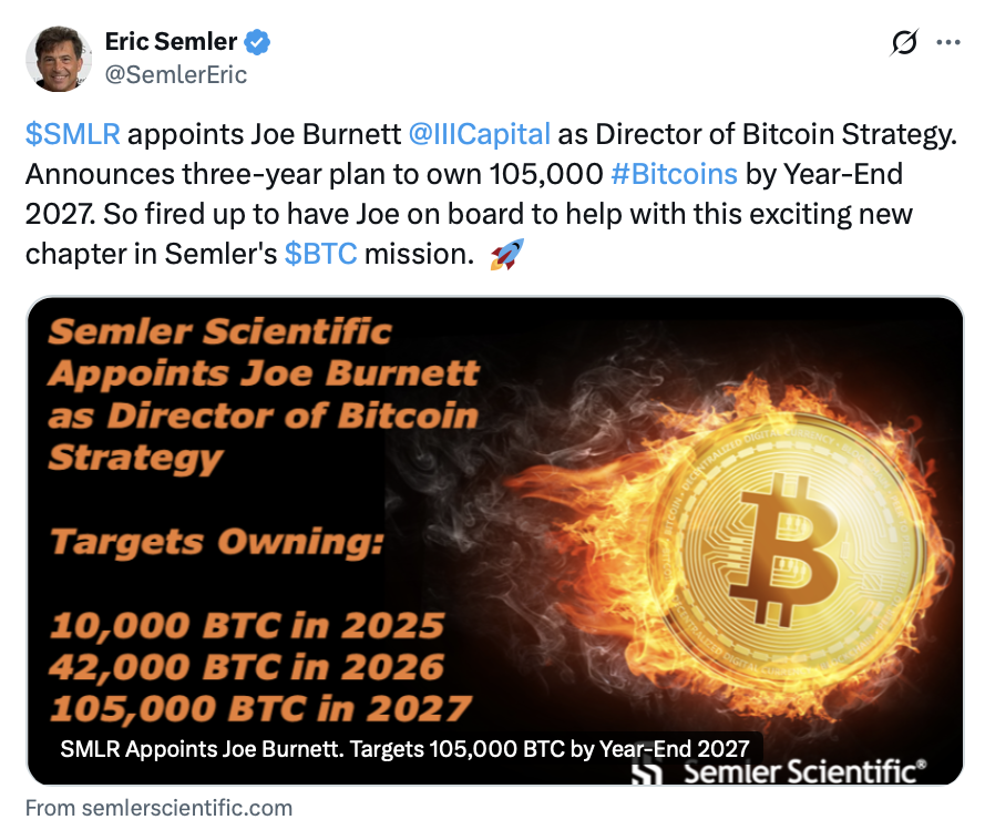 Am Donnerstag kündigte Semler Scientific Pläne an, seine Bitcoin-Bestände in den nächsten zweieinhalb Jahren um fast das 23-fache zu erhöhen und seinen Bestand von 4.449 Bitcoin auf 105.000 Bitcoin zu steigern. Semler strebt an, bis Ende dieses Jahres insgesamt 10.000 Bitcoin zu halten.