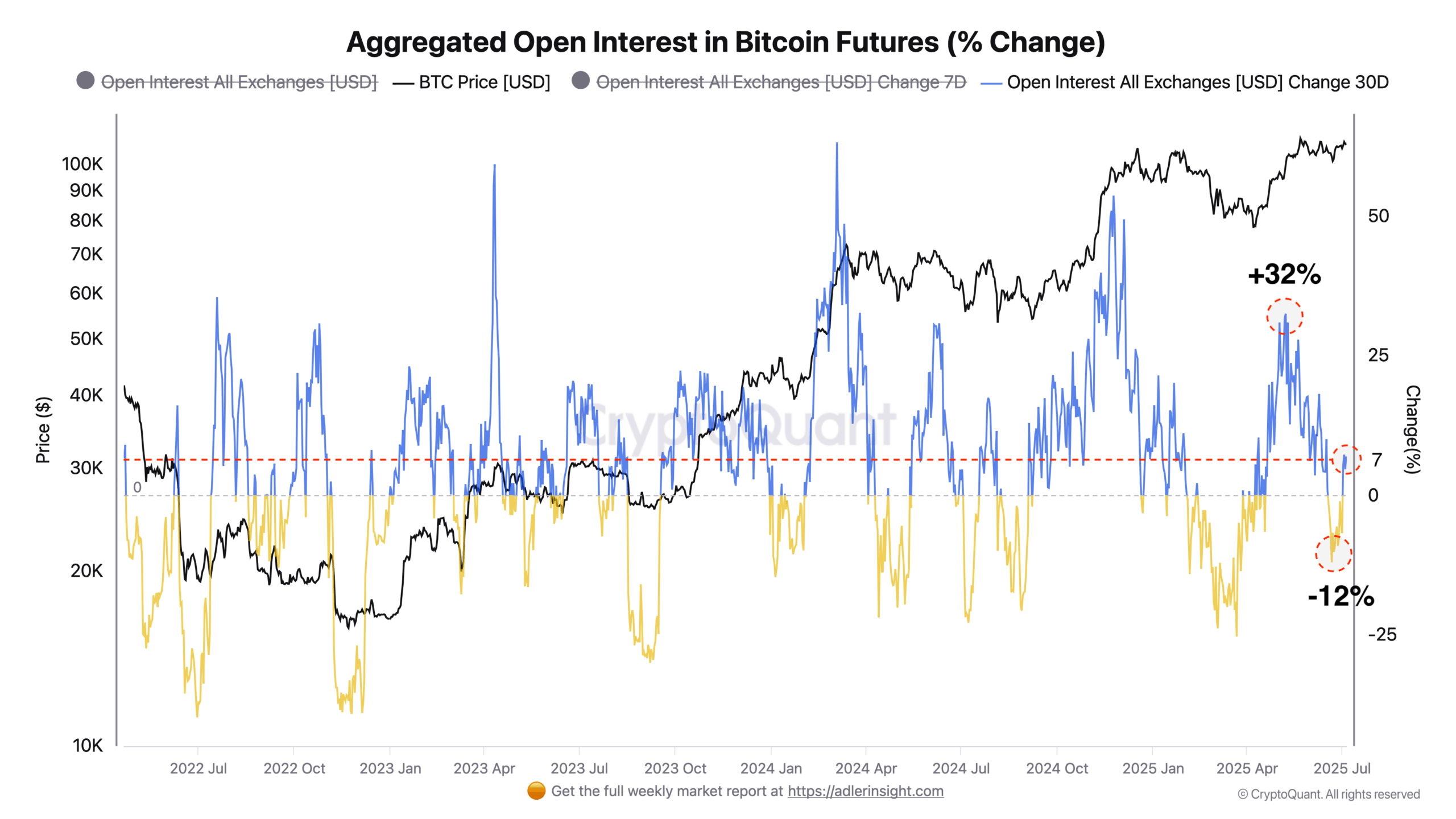 Zusätzlich merkte Adler Jr. an, dass der Bitcoin Futures Market Power v2.0 Indikator, der OI, Finanzierungsraten und Aggression auf der Nehmerseite kombiniert, derzeit bei 22.000 liegt. Obwohl der Indikator weit von den euphorischen Niveaus vergangener Rallyes mit Werten über 80.000 entfernt ist, spiegelt er einen wachsenden Druck auf der Long-Seite und einen zunehmenden bullischen Konsens ohne Anzeichen einer Überhitzung wider. Der Indikator weist zum ersten Mal seit Mai einen positiven Wert auf, während ein Wert im Bereich von 20.000 den Tiefpunkt im April signalisierte.
