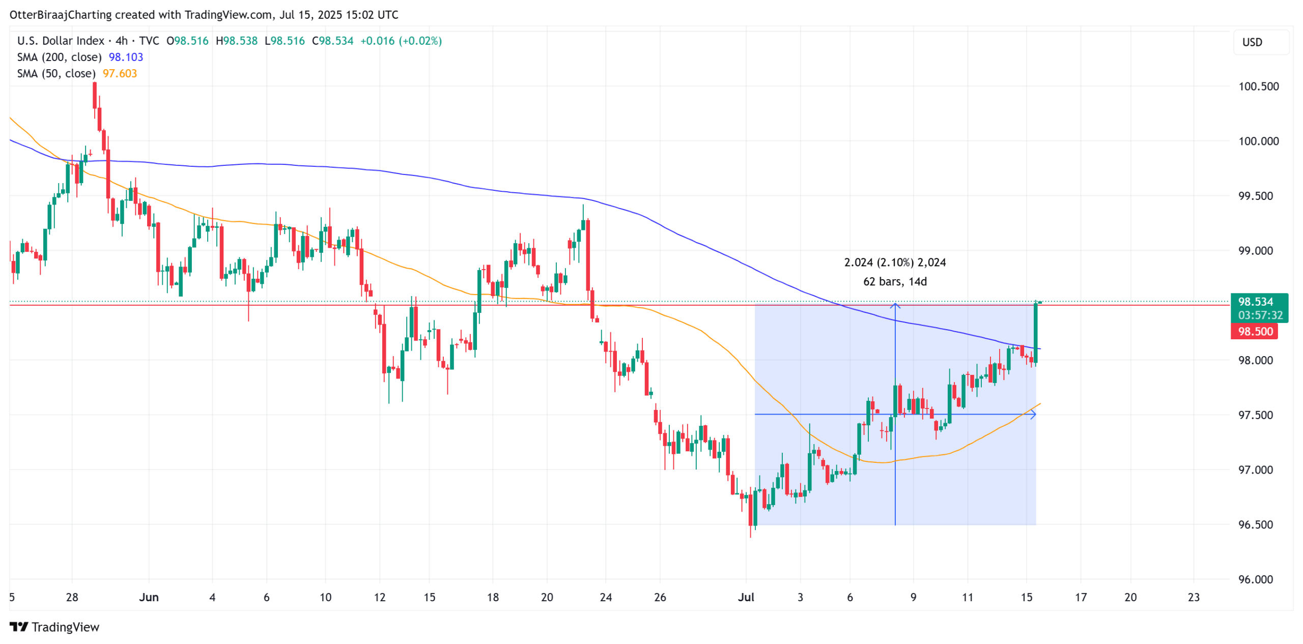 Die Daten unterstreichen, dass die Inflation weiterhin hartnäckig ist, insbesondere in Schlüsselsegmenten wie Lebensmittel und Verkehr, während die Preise für Unterkünfte nur geringfügig nachgegeben haben. Die Märkte reagierten vorsichtig, und der US-Dollar-Index (DXY) stieg im Juli deutlich auf 98,5 und damit um 2,1 %.
