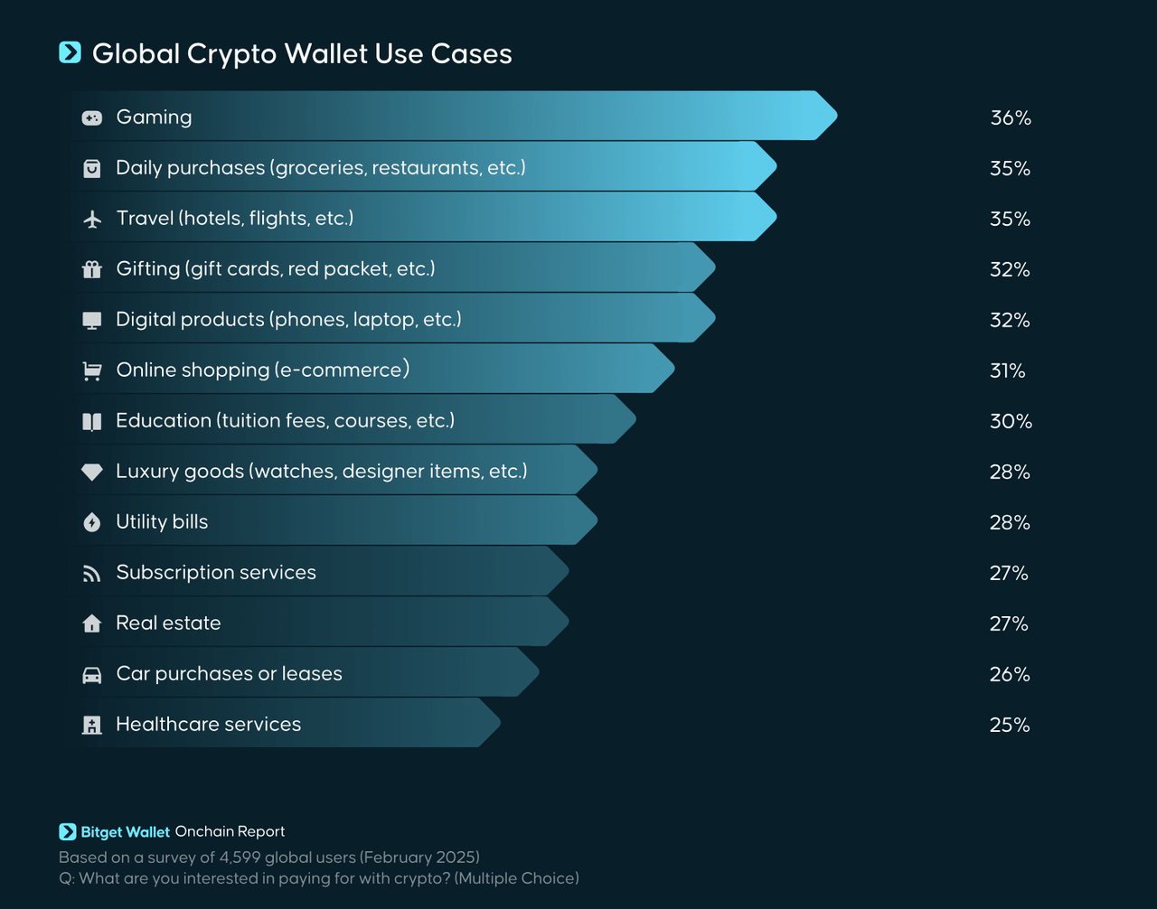 Der Traum vom alltäglichen Einsatz digitaler Assets rückt näher: Ein neuer Onchain-Bericht von Bitget Wallet enthüllt, wie Nutzer weltweit Kryptowährungen in ihrem täglichen Leben integrieren möchten. Die Umfrage unter 4.599 Wallet-Nutzern von Anfang 2025 zeichnet ein klares Bild des Paradigmenwechsels von reiner Spekulation hin zu praktischen Anwendungen.