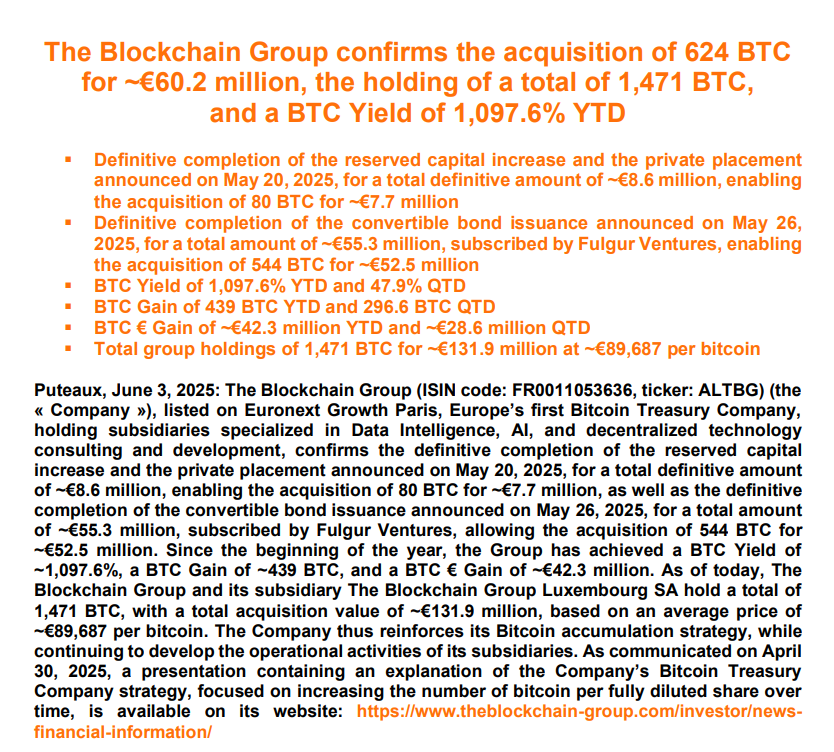Mit dem jüngsten Kauf liegt der Gesamtbestand des Unternehmens bei 1.471 Bitcoin oder über 154 Millionen US-Dollar, mit einer BTC-Rendite von 1.097,6 % im bisherigen Jahresverlauf, so die Blockchain Group in einem X-Post vom 3. Juni.
