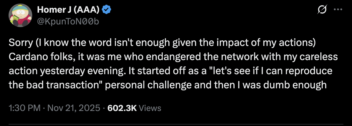 Der Exploit wurde von einem ADA-Staking-Pool-Betreiber namens Homer J verursacht, der KI-generierten Code verwendete, um die Transaktion durchzuführen, und die Verantwortung für die Netzwerkpartitionierung übernommen hat.