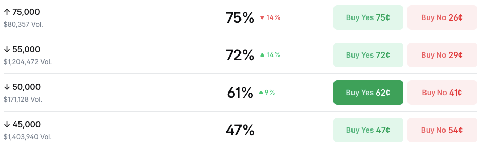 Weitere pessimistische Prognosen gehen von Kursrückgängen unter 50.000 US-Dollar und 45.000 US-Dollar aus, mit einer Wahrscheinlichkeit von 61 % bzw. 47 % und einem Handelsvolumen von 170.000 US-Dollar bzw. 1,4 Millionen US-Dollar.