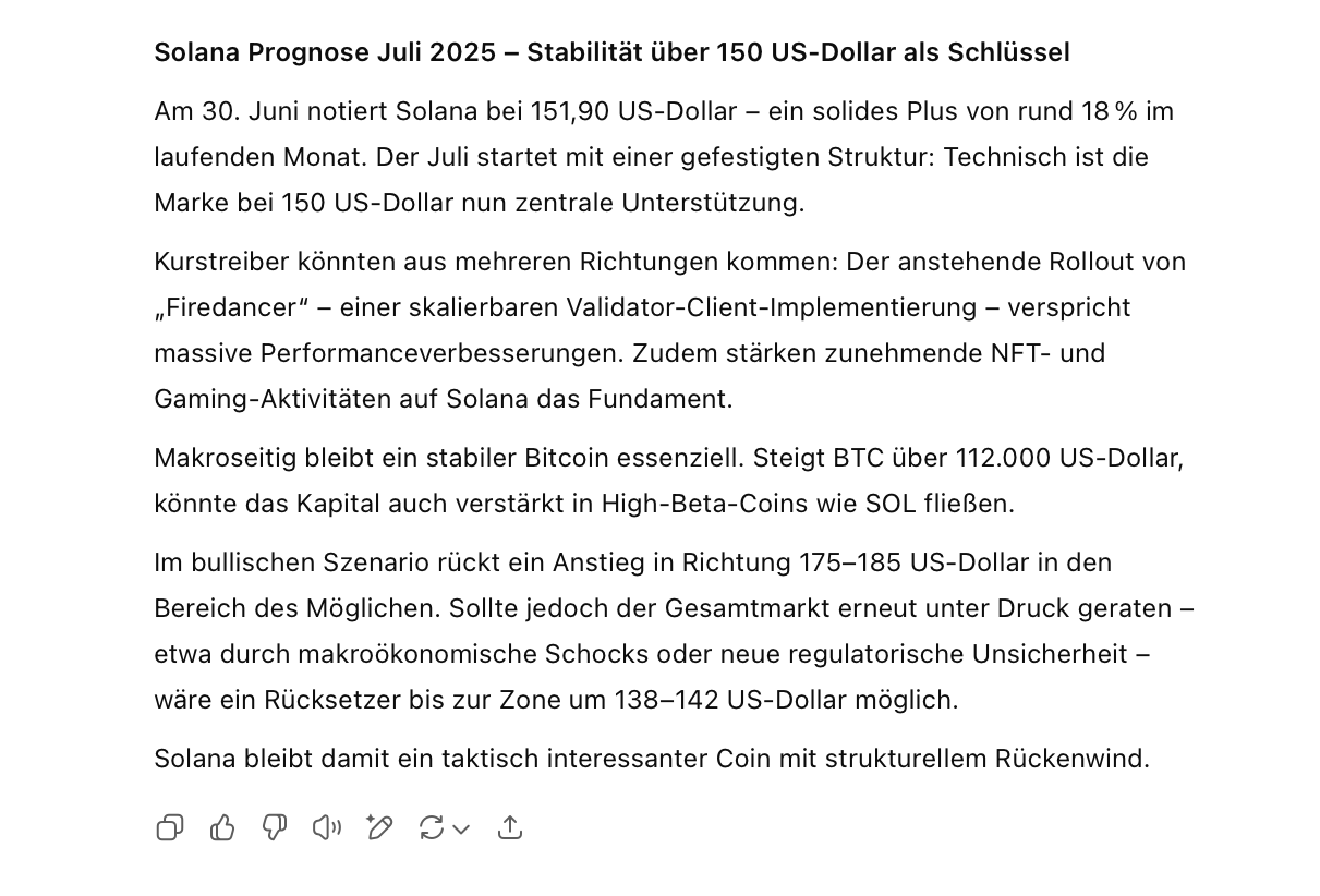 Gemini, das KI-Tool von Google, analysiert die Juli-Perspektive für Solana (SOL) unter Berücksichtigung technischer Entwicklungen, Marktsentiment und institutioneller Dynamik. Der Startpunkt liegt auch hier bei einem Kursniveau von 151,90 US-Dollar – mit leicht positiver Tendenz.