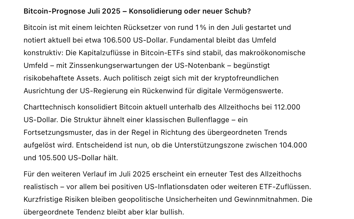 Aus charttechnischer Sicht deutet sich eine klassische Bullenflagge an – ein Fortsetzungsmuster, das tendenziell neue Impulse nach oben auslösen könnte. Wichtig sei, dass die Unterstützungszone zwischen 104.000 und 105.500 US-Dollar hält. Ein erneuter Anlauf auf das Allzeithoch bei 112.000 US-Dollar erscheint möglich – insbesondere bei freundlichen Inflationsdaten oder weiteren ETF-Zuflüssen. Trotz geopolitischer Risiken bleibt die übergeordnete Tendenz laut ChatGPT klar bullisch.