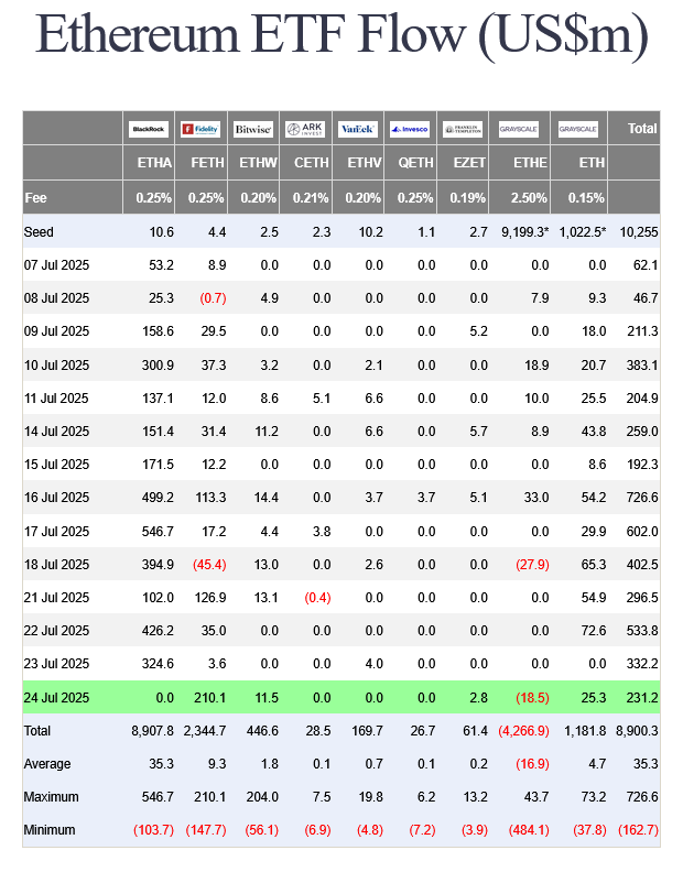 Kapitalzuflüsse in Ethereum-ETFs. Quelle: Farside Investors.