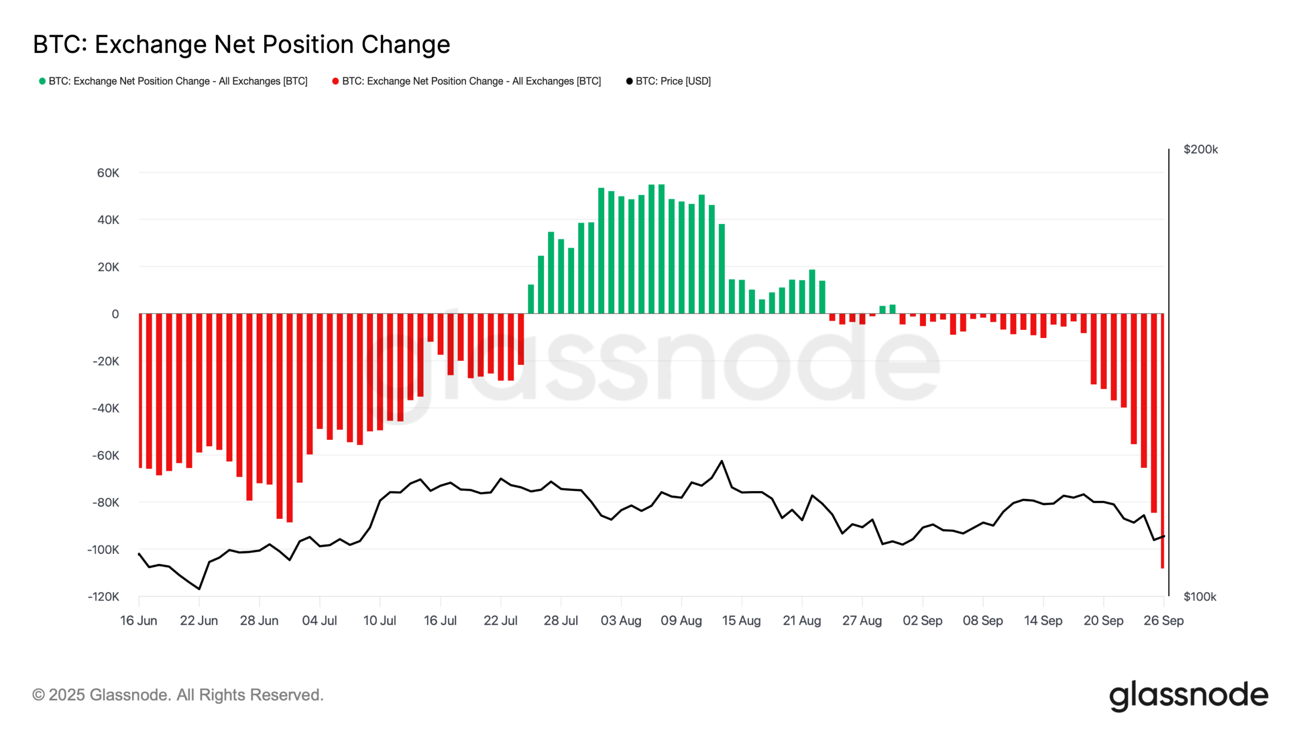 Die Kennzahl „Exchange Net Position Change“ misst hier, ob Anleger ihre Bitcoin-Bestände auf Börsen einzahlen oder abziehen. Positive Werte deuten auf Zuflüsse hin, was in der Regel Verkaufsdruck erzeugt, da mehr Coins potenziell handelbar sind. Im Juli bis Ende August waren genau solche Zuflüsse erkennbar, was zeitweise für eine gedämpfte Kursentwicklung sorgte. Seit Anfang September hat sich das Bild jedoch verändert. Zunächst waren nur leichte Abflüsse zu beobachten, doch ab Mitte September nahm die Dynamik deutlich zu. Inzwischen werden wieder massiv Bestände von den Börsen abgezogen. Dies gilt als bullisches Signal in einer Bitcoin Prognose.