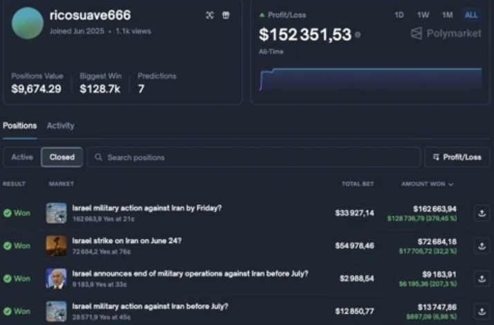 Das Konto soll Zehntausende Dollar eingesetzt und über 152.300 US-Dollar gewonnen haben, indem es auf Wetten wie „Israel greift Iran am 24. Juni an“ und „Israelische Militäraktion gegen Iran bis Freitag“ gesetzt hat, wobei letztere über 128.700 US-Dollar einbrachte.