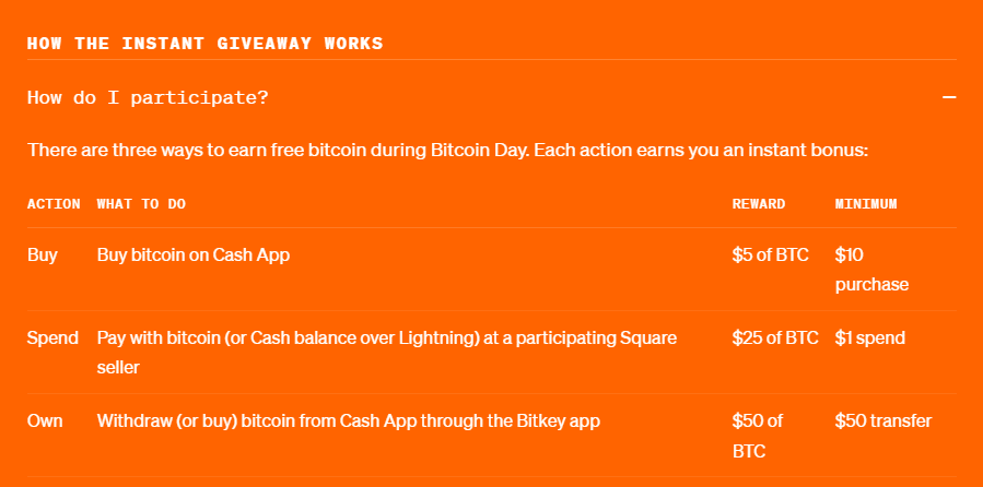 Each bonus is applied immediately to the user’s Cash App Bitcoin balance, and customers can earn a maximum of $80 in total bonuses by completing all three actions.
