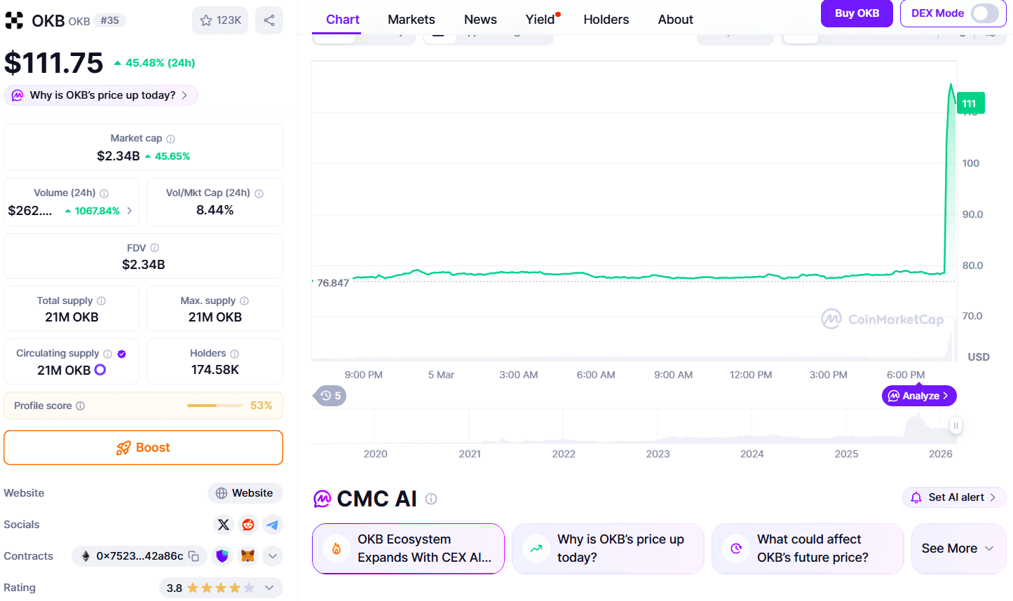 CoinMarketCap data shows that OKB rose from $78 to roughly $118 shortly after the announcement. The token’s 24-hour trading volume also spiked by more than 1,000%.