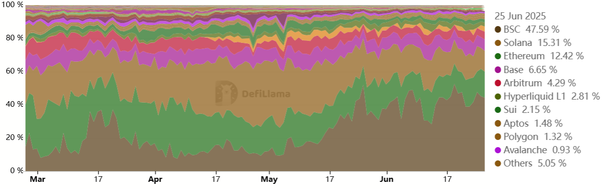 Eine weitere Sorge für SOL-Investoren ist der Aufstieg von Hyperliquid, das sich zur dominierenden Blockchain für den dauerhaften Handel entwickelt hat. Diese Verschiebung hat das Interesse sowohl an Ethereum Layer-2s als auch an eigenständigen dezentralen Anwendungen (DApps) auf Solana und BNB Chain verringert.