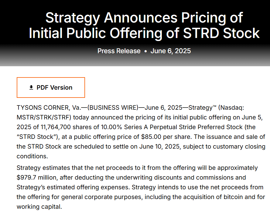 Strategy schätzt, dass der Nettoerlös nach Abzug der Emissionsabschläge und -provisionen für die Angebotskosten des Unternehmens etwa 979,7 Mio. USD betragen wird, wie in einer Mitteilung vom 6. Juni zu lesen war.