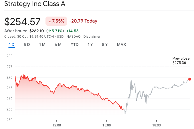 Die Aktien von Strategy (MSTR) stiegen nachbörslich um 5,7 % auf über 269 US-Dollar, nachdem sie den Handel am Donnerstag mit einem Minus von über 7,5 % bei einem Sechsmonatstief von 254,57 US-Dollar beendet hatten.
