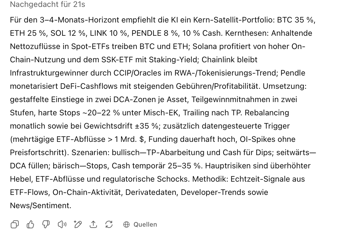 Darüber hinaus wird ein Cash-Anteil von 10 % empfohlen, um flexibel auf Marktchancen reagieren oder Rückschläge abfedern zu können. Beim Risikomanagement setzt Grok auf klare Stop-Loss-Marken, etwa bei Bitcoin um 110.000 US-Dollar, sowie auf Trailing Stops. Das Portfolio soll monatlich überprüft und angepasst werden.