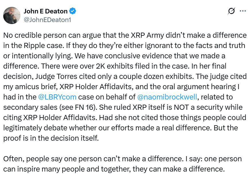 Deaton führt aus, dass über 2.000 Beweisstücke in dem Gerichtsverfahren eingereicht worden seien, und in ihrer endgültigen Entscheidung zitierte Richterin Torres auch seinen Amicus Brief und die eidesstattlichen Erklärungen mehrerer XRP-Anleger.