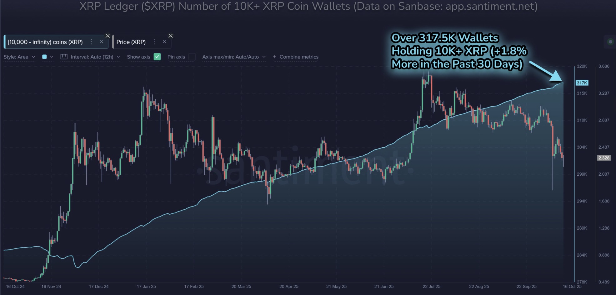 Der Whale Count von Santiment zeigt, dass die Anzahl der Wallets, die mindestens 10.000 XRP halten, mit etwa 317.500 einen neuen Höchststand erreicht hat.