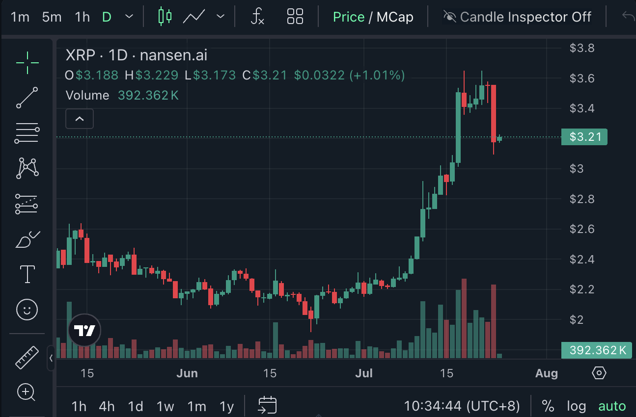 XRP wird zum Zeitpunkt der Veröffentlichung bei 3,21 US-Dollar gehandelt, was laut Nansen einem Rückgang von 10,20 % in den letzten 24 Stunden entspricht.