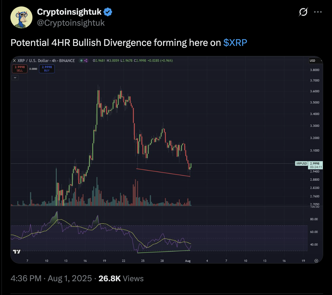 Im Vierstundendiagramm steuert XRP auf eine bullische Divergenz zu, was in der Regel ein klares Anzeichen für eine baldige Trendwende ist.